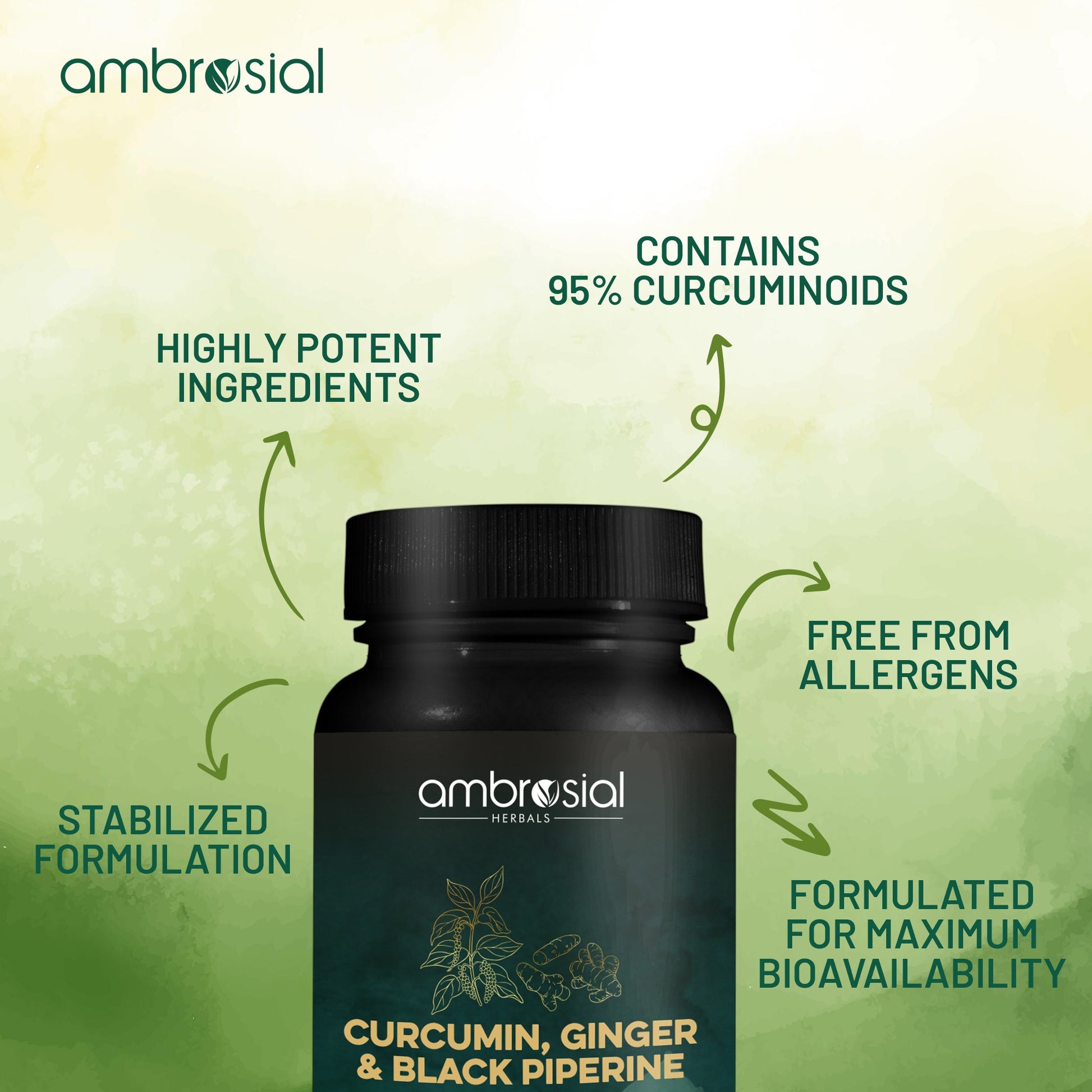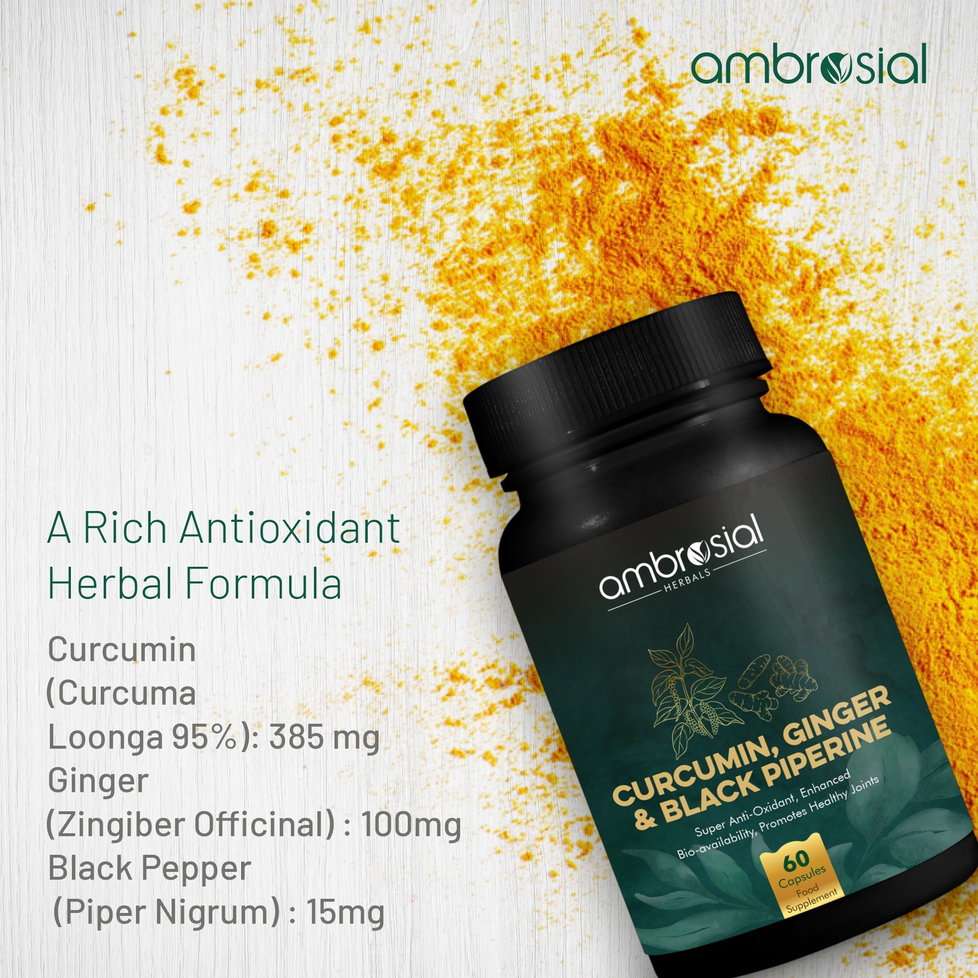 Ambrosial Curcumin Capsules 2000mg with Piperine & Ginger | 60 High Strength Curcumin Supplements | Turmeric, Ginger & Piperine Capsules | Vegan and Gluten Free