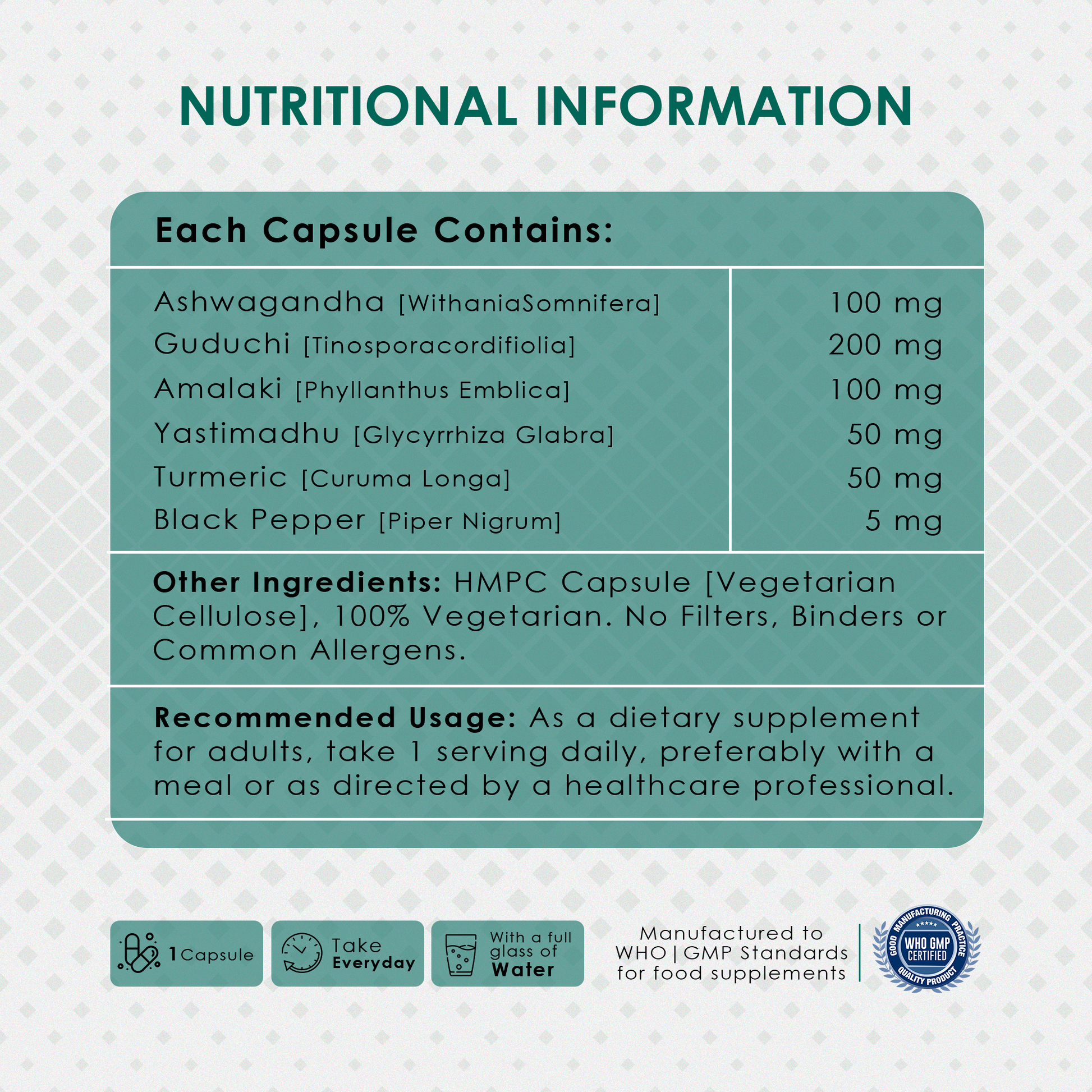 Ashwagandha, Guduchi (Tinospora Cordifolia), Amalaki, Yashtimadhu, Turmeric & Black pepper.
