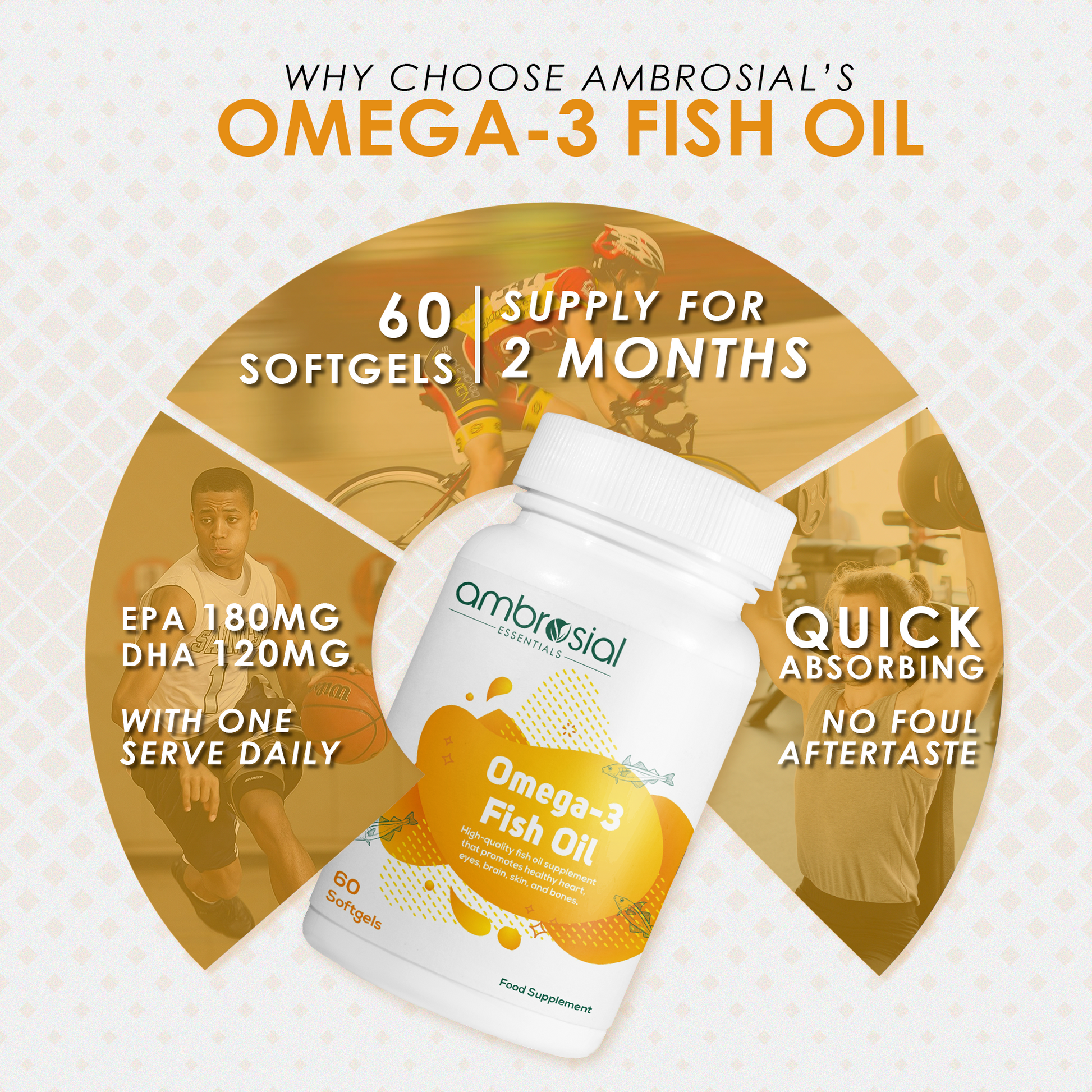 Ambrosial Omega 3 Fish Oil 1000mg | Omega 3 Fatty Acid capsules with 180 mg EPA 120 mg DHA - 60 Softgels | Omega 3 Fish Oil Supplements for Women and Men