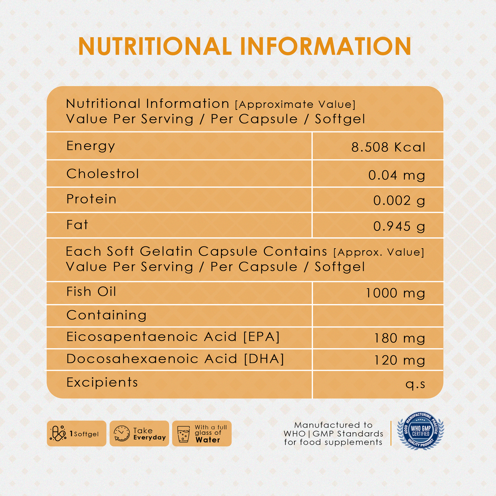 DHA (Docosahexaenoic acid) - 120 mg || EPA (Eicosapentaenoic acid) - 180mg
