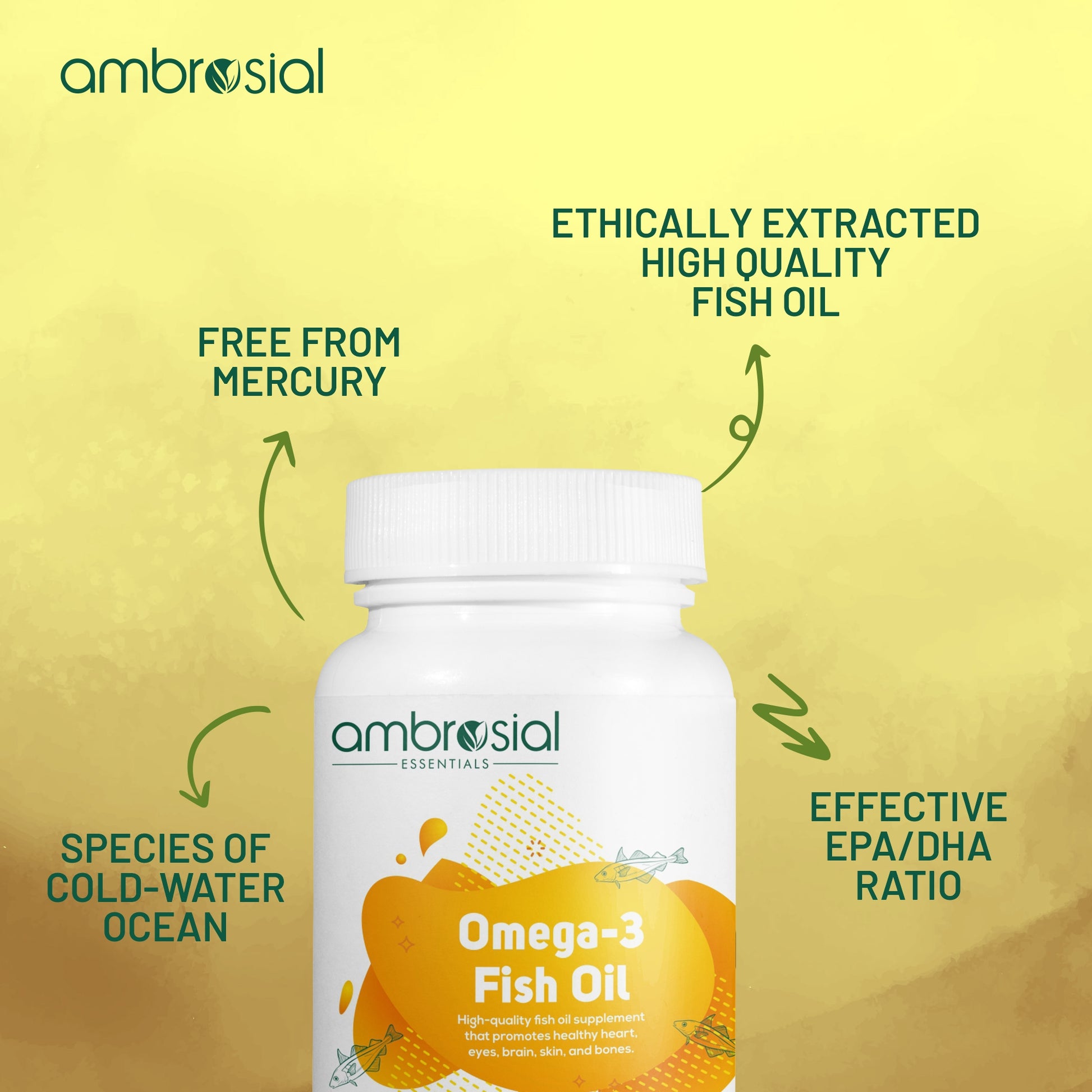Ambrosial's Omega-3 Fish Oil soft capsule contains 1000mg EPA fish oil per serving (180 mg EPA and 120 mg DHA).