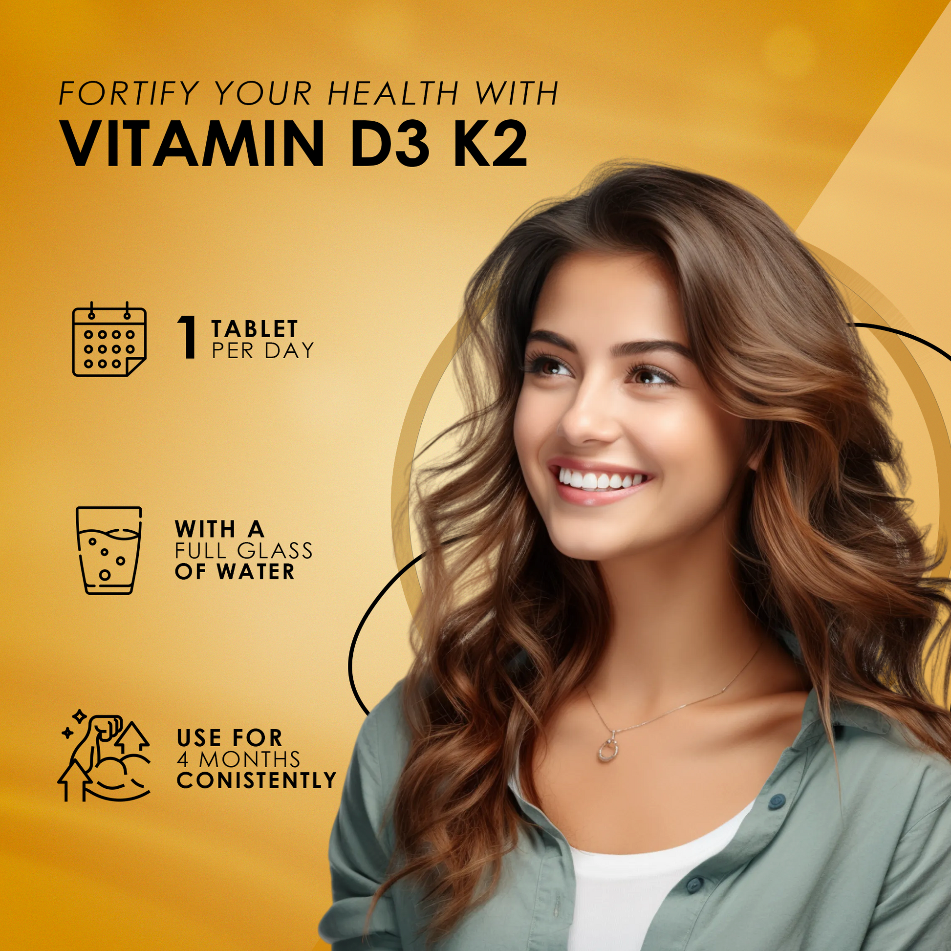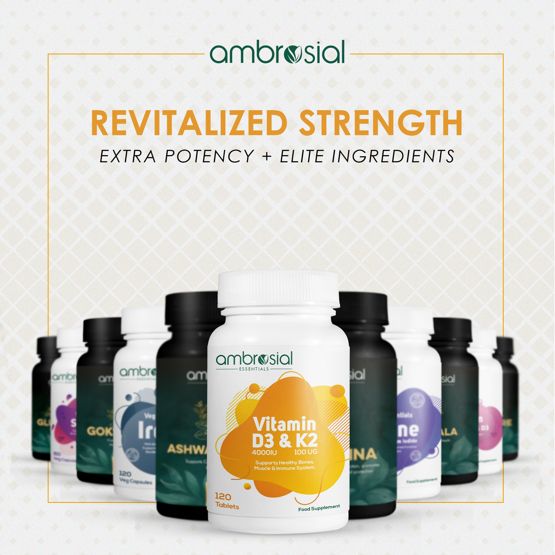 • Why Choose Ambrosial Vitamin D3 & K2 Tablets? Ambrosial Vitamin D3 & K2 Tablets offers a potent combination of Vitamin D3 and K2 in one convenient tablet. This carefully formulated product is made with high-quality ingredients and adheres to strict manufacturing standards, providing a reliable supplement for your daily health regimen.