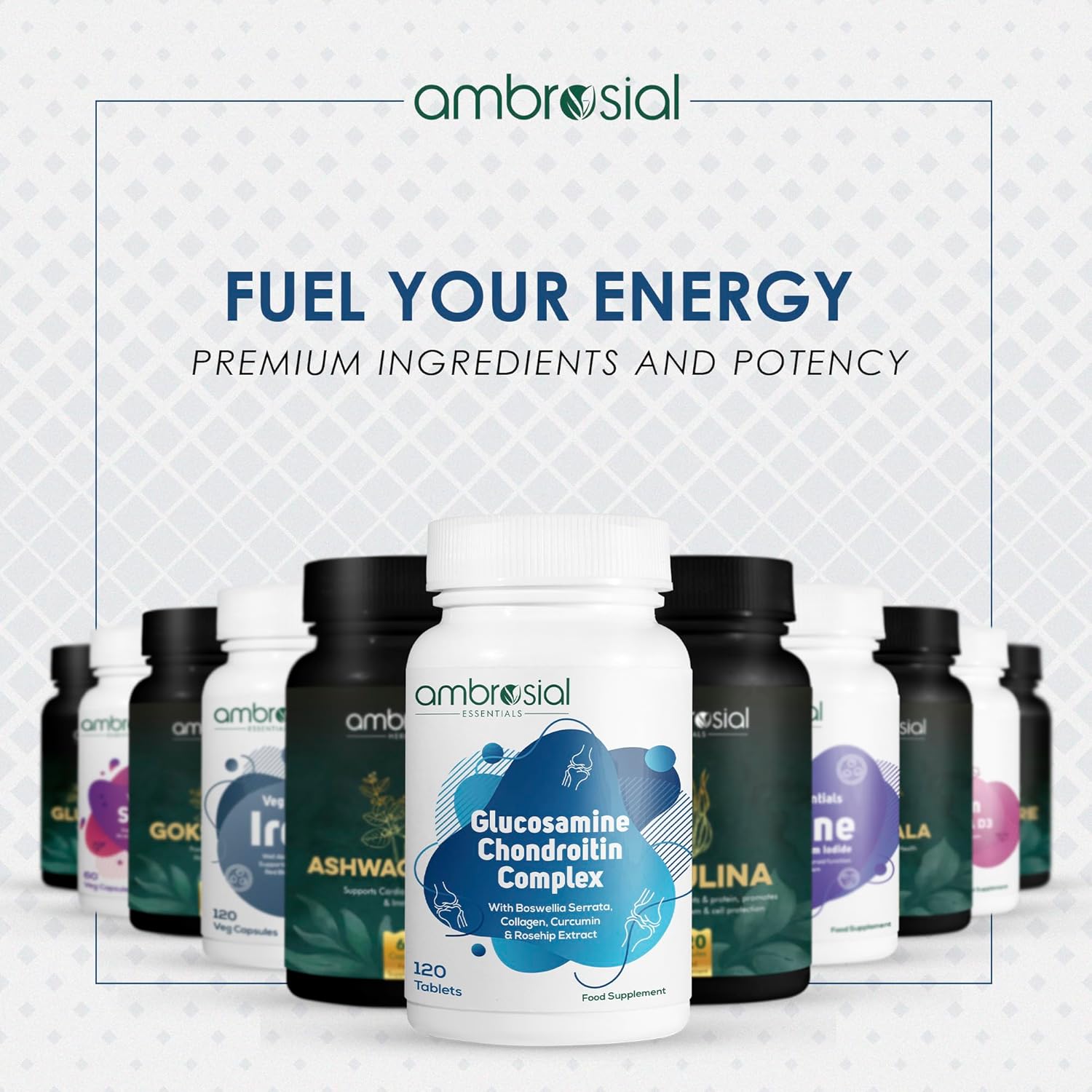 Ambrosial Glucosamine Chondroitin Joint Care Supplements for High Mobility & Flexibility | High Strength Glucosamine Chondroitin with Curcumin, Collagen, Boswellia & Rosehip Extracts | 120 Tablets