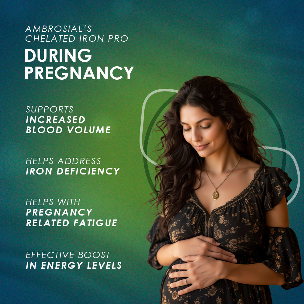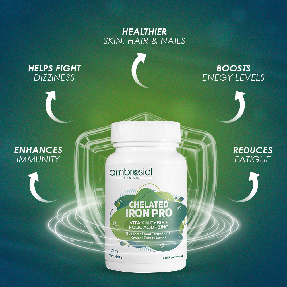 Ambrosial’s Chelated Iron Pro features a blend of chelated iron with vitamin C, B12, folic acid, and zinc—crafted to support your daily wellness needs.