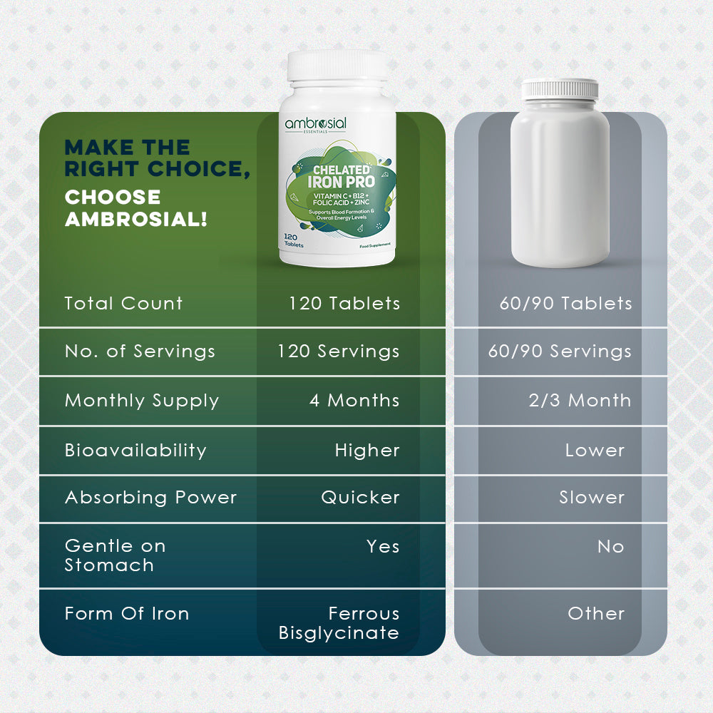 Ambrosial Chelated Iron Pro with Vitamin C, B12, Folic Acid & Zinc – Gentle on Stomach | Iron Supplement for Daily Use | 120 Veg Tablets